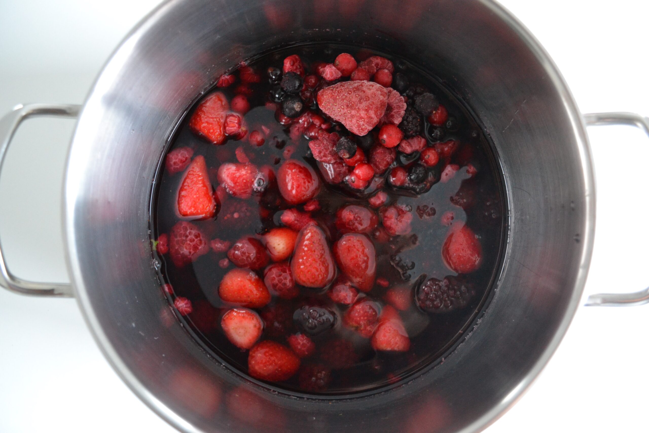 Rode vruchten met water Rood fruit klaar om af te gieten Inkoken met Gelfix Gelei rood fruit