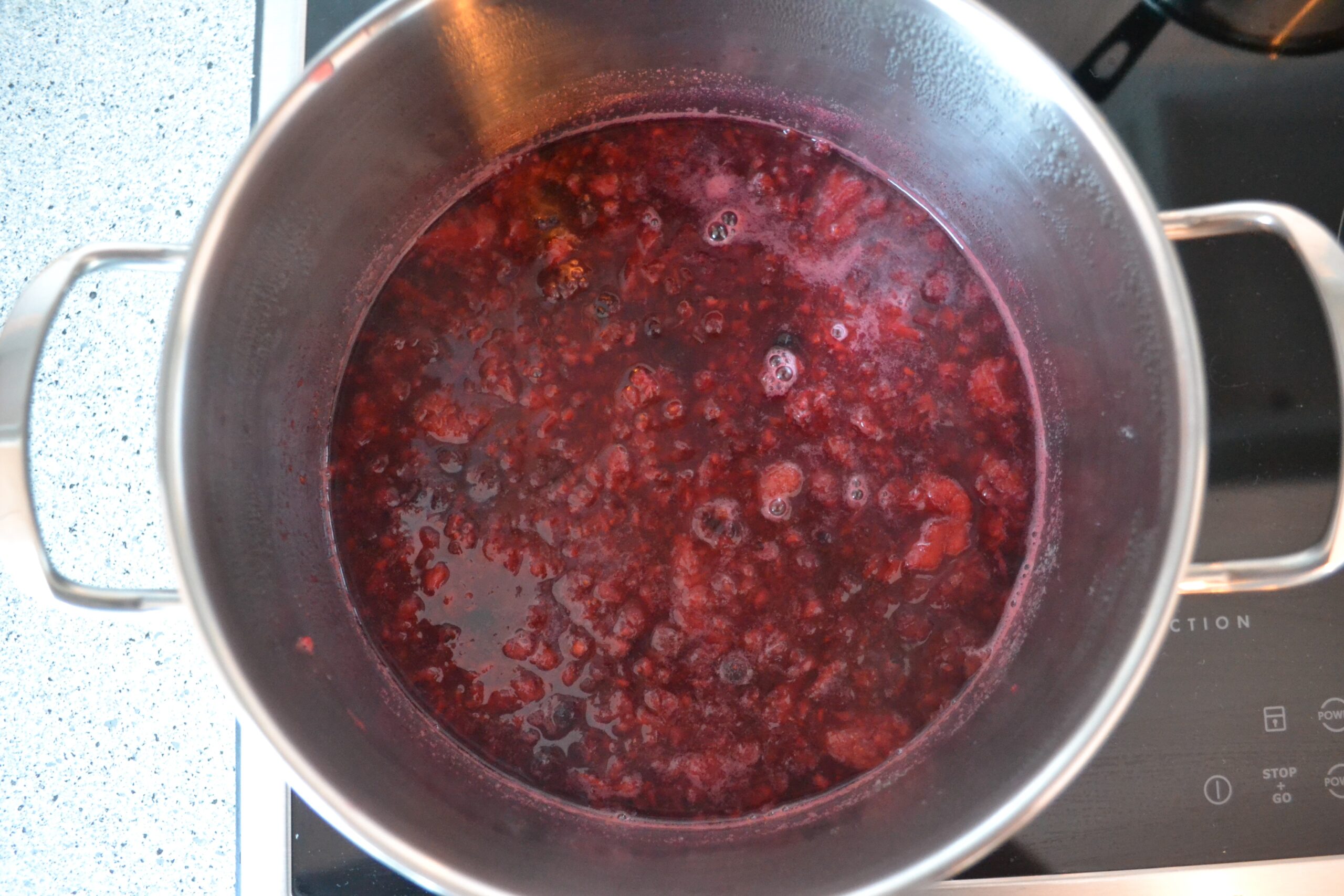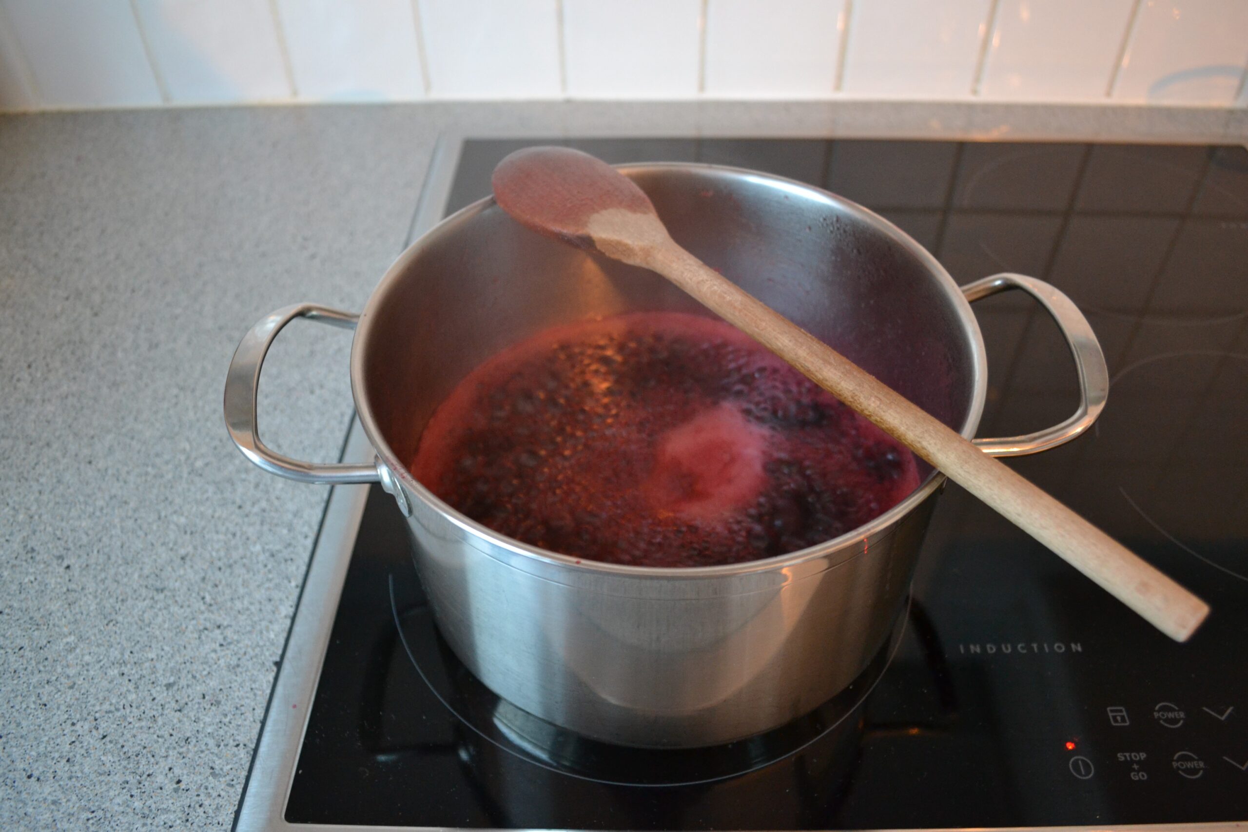 - Na een drietal minuten zou je een mooie gelei moeten hebben. Check of deze dik genoeg is. Zo niet, laat nog even verder pruttelen.