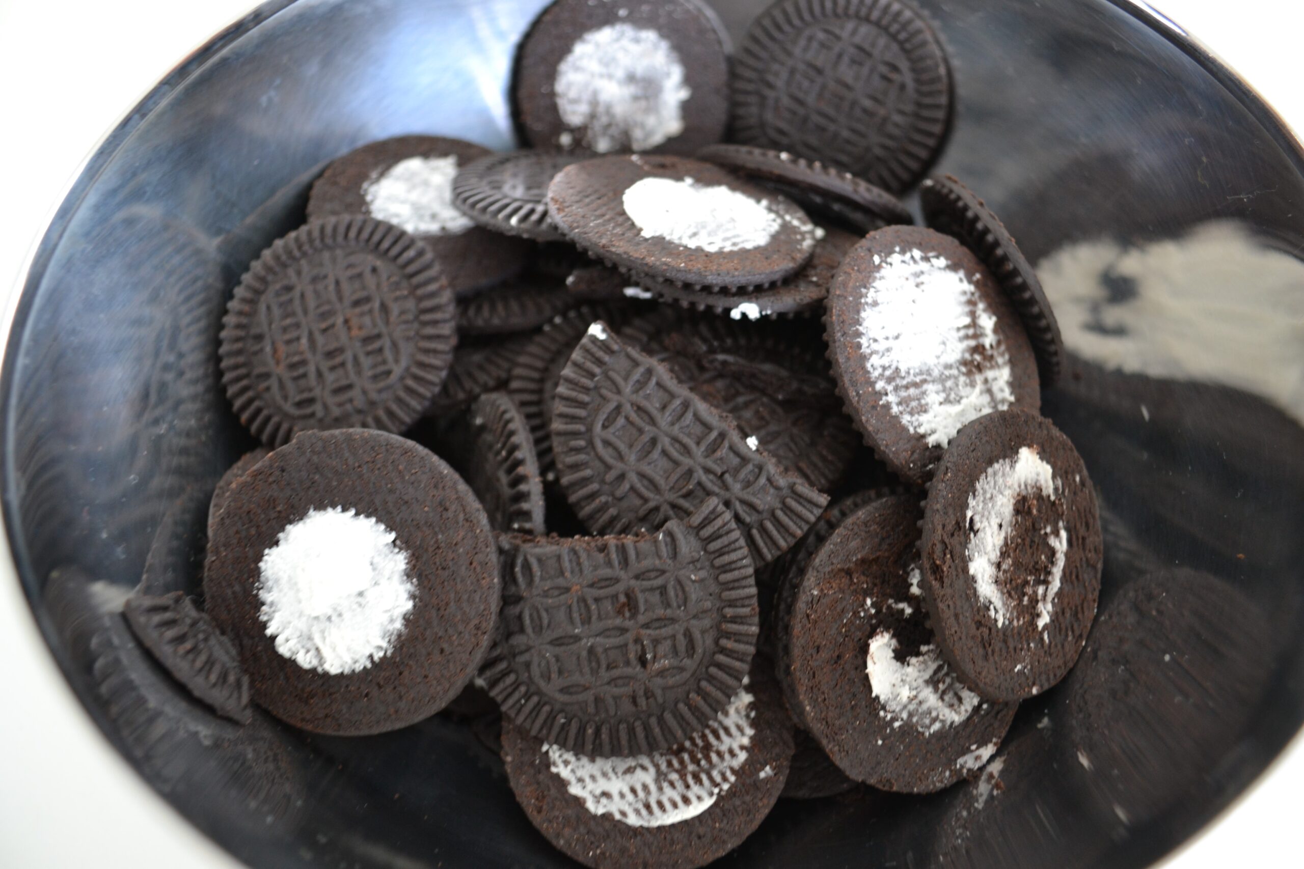 - Neem 350 gram koekjes en verwijder de crème vulling door de koekjes te splitsen en de witte vulling er met een mesje af te schrapen.