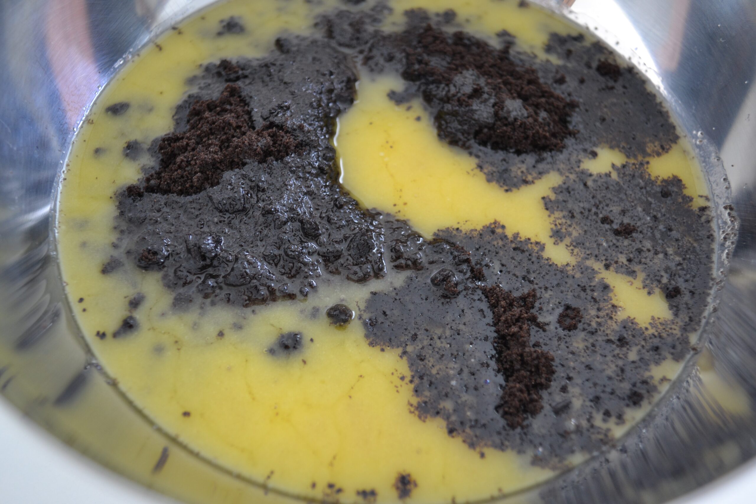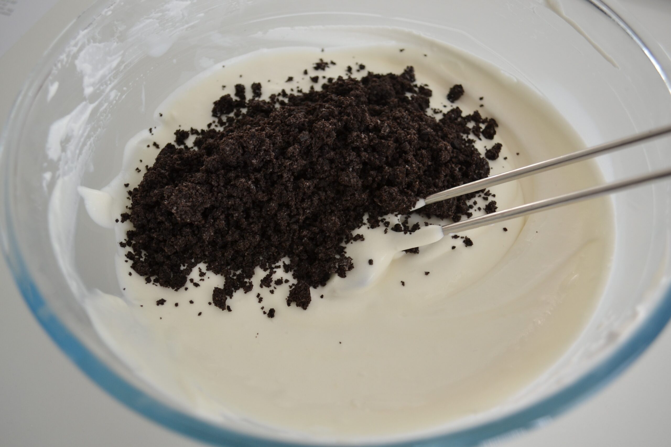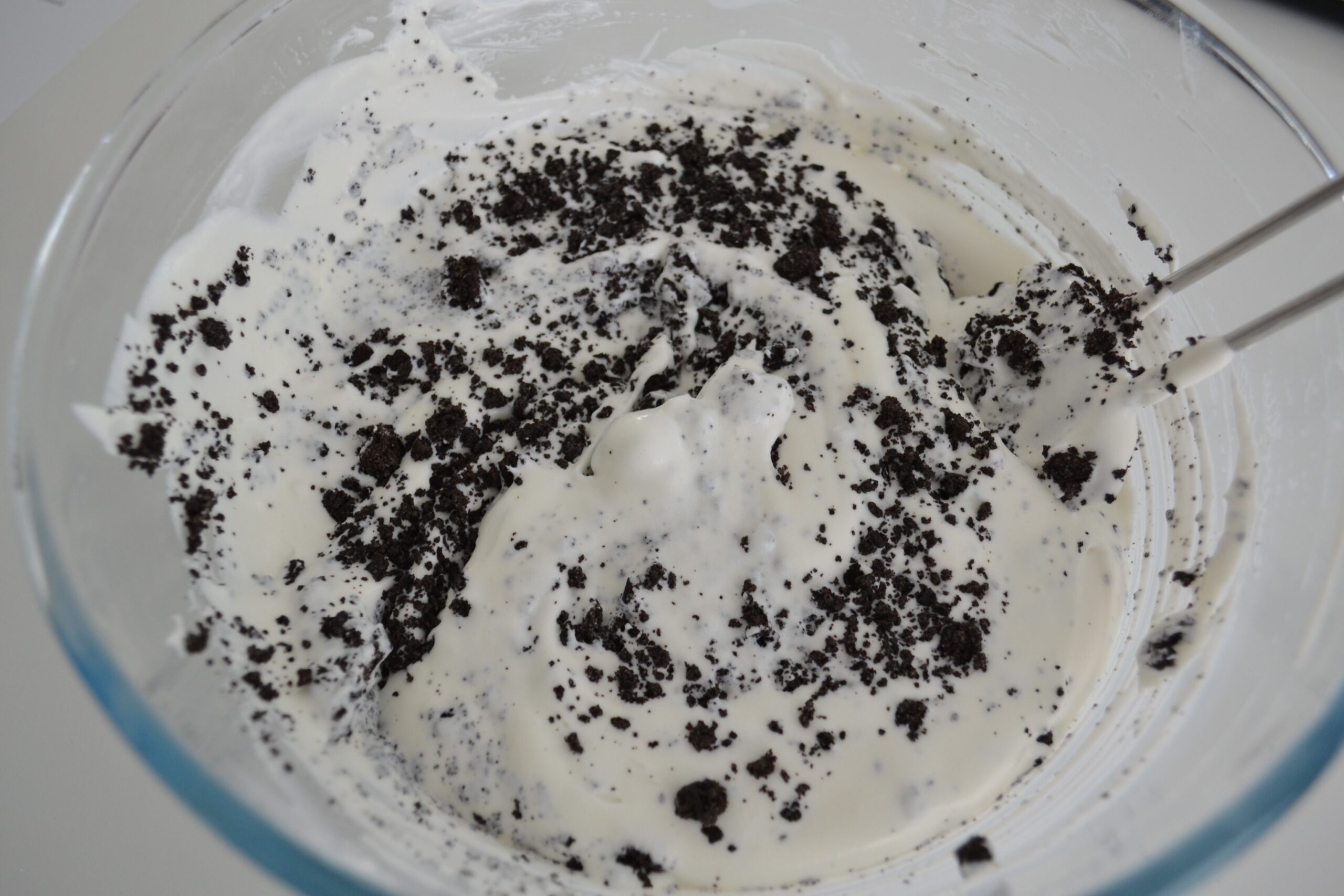 - Verkruimel 175 gram koekjes (inclusief de crème vulling) met een pureestamper en schep deze onder het mengsel.