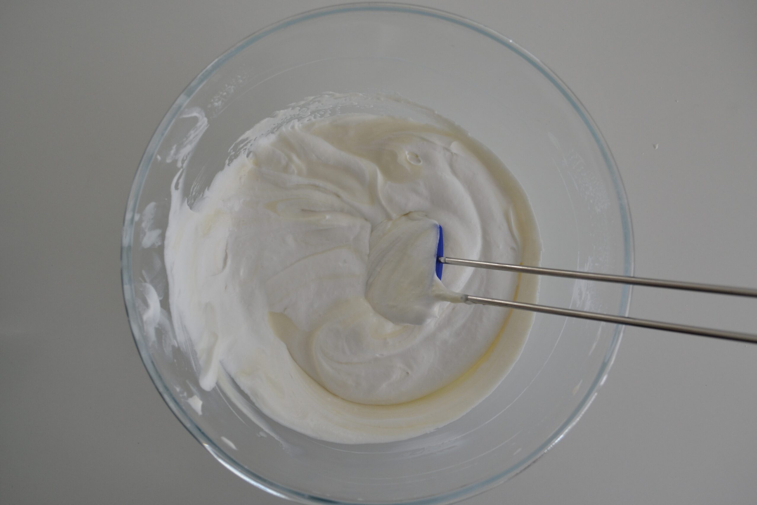 - Klop de slagroom stijf en voeg deze daarna al roerend aan het mengsel toe.