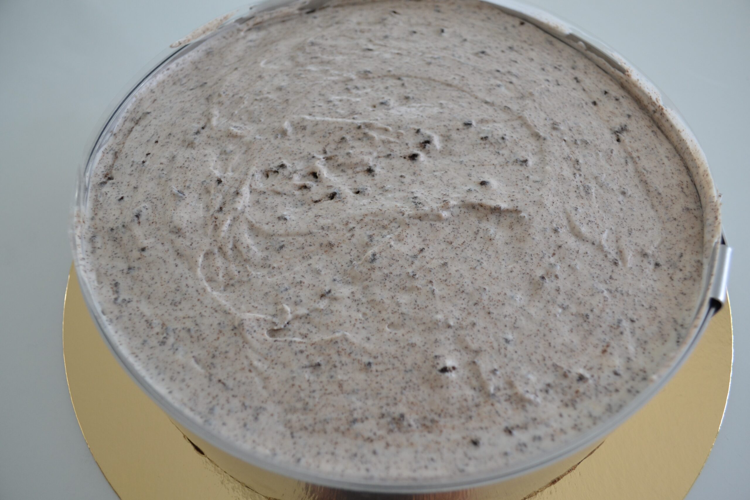 - Haal de taartring/springvorm uit de koelkast en stort er de vulling op. Strijk ze goed glad (met bijvoorbeeld een pannenlikker) en werk af met black Cookies.