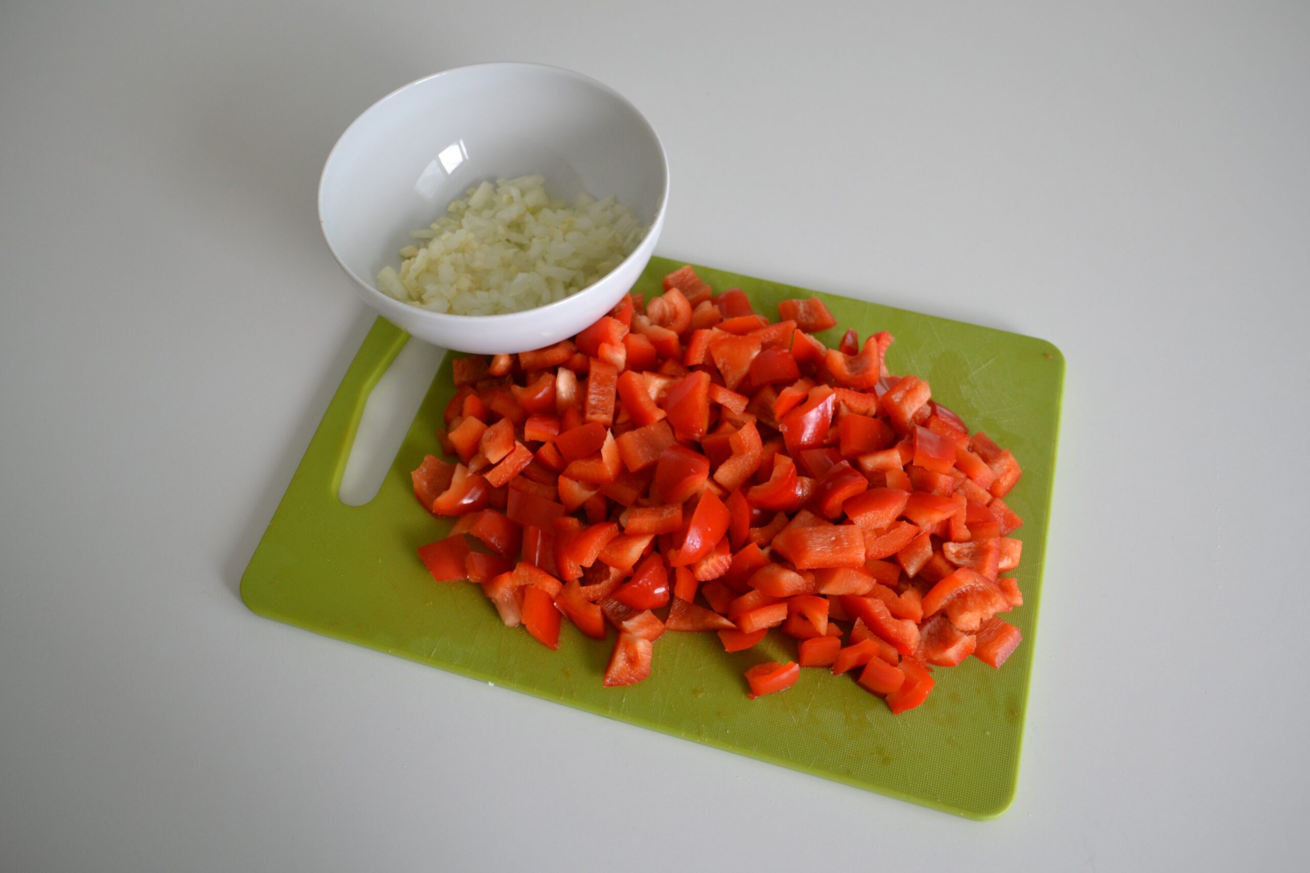- Verwijder de stelen en de pitjes van de paprika’s en snijdt ze in stukken.