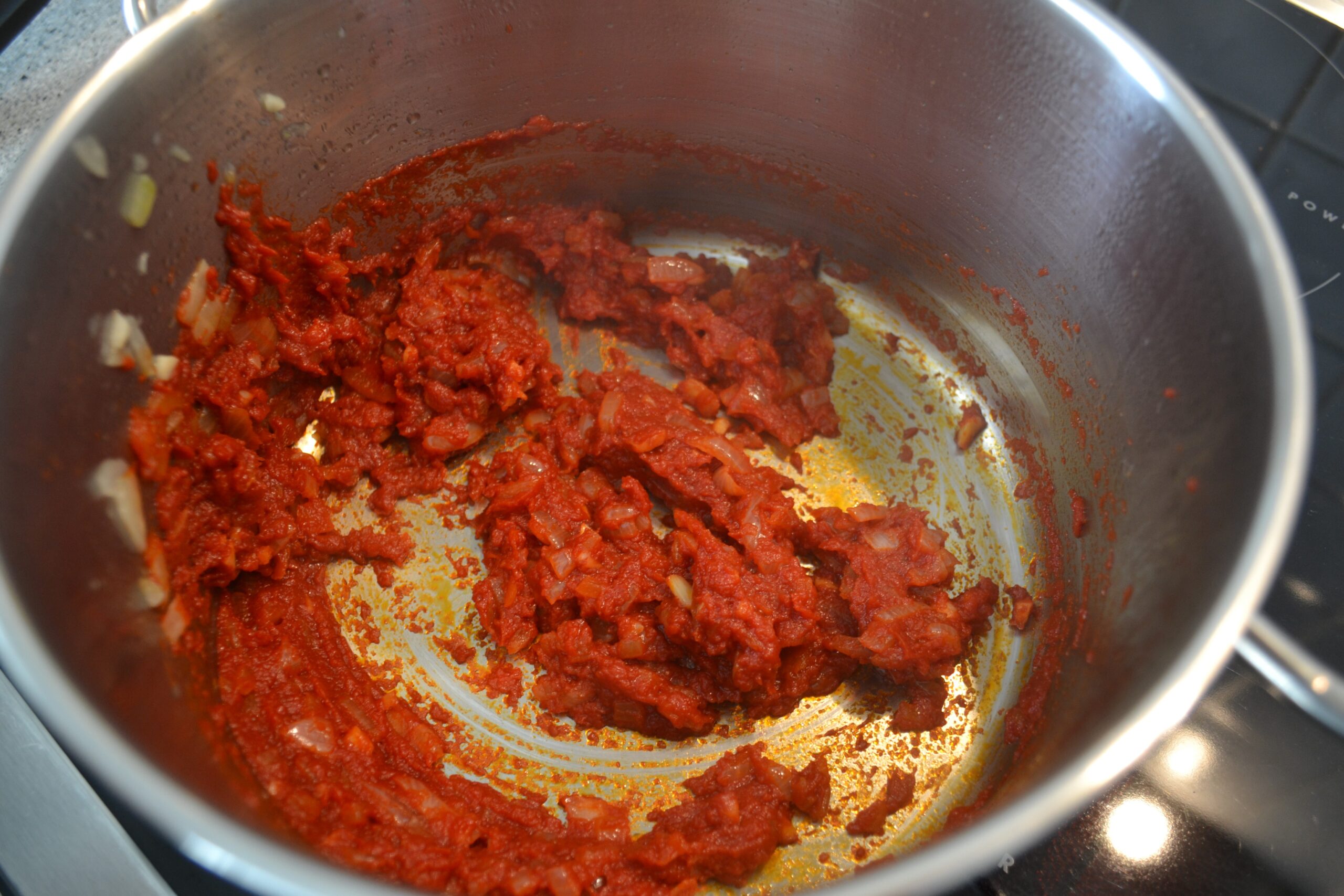 - Voeg de tomatenpuree toe en laat even meebakken. Roer even om aanbakken te voorkomen.