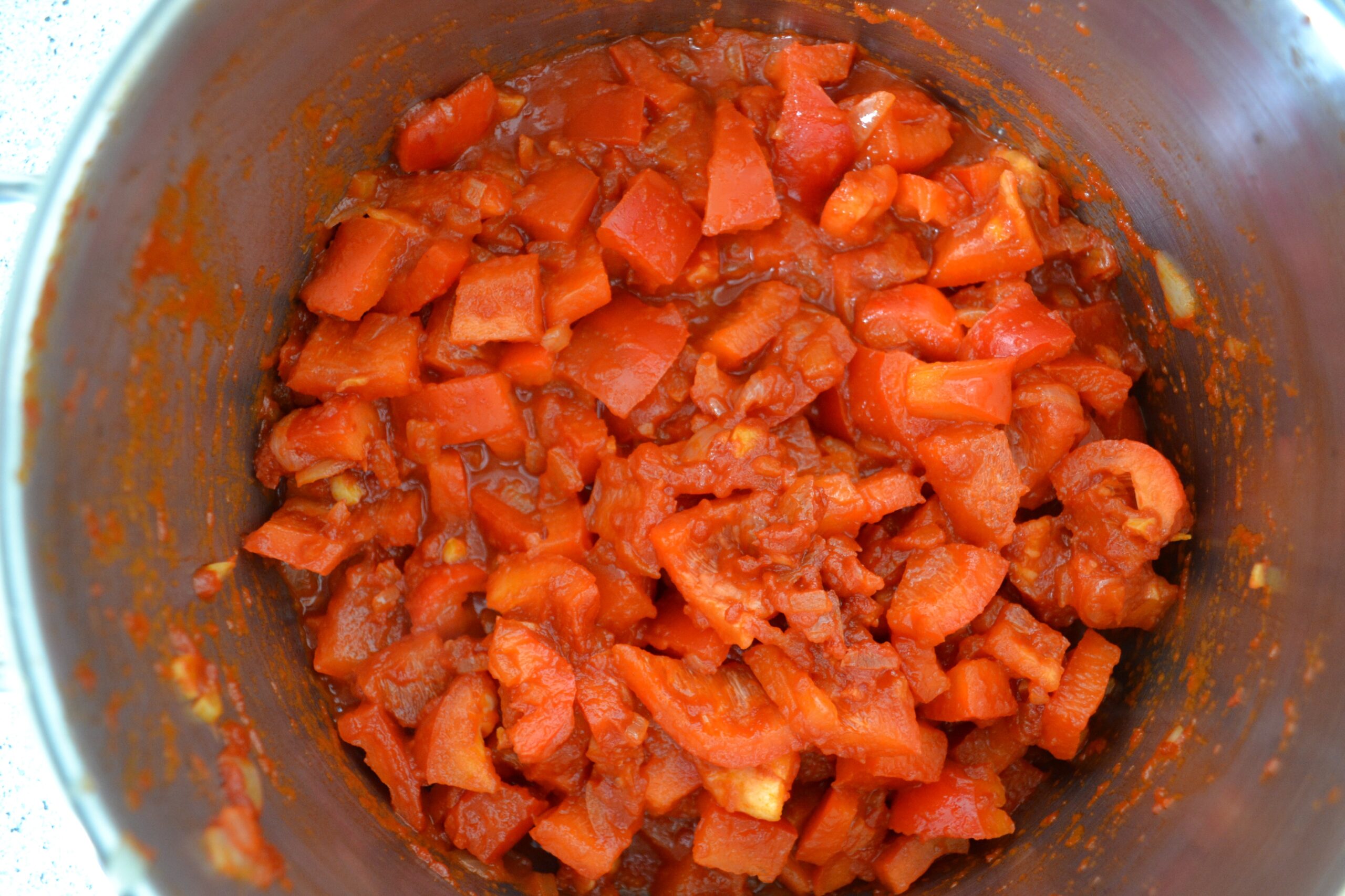 - Voeg de paprikablokjes toe en een klein beetje water. (Tip: doe het water in het blikje van de tomatenpuree, zo maak je dit ook meteen netjes.)