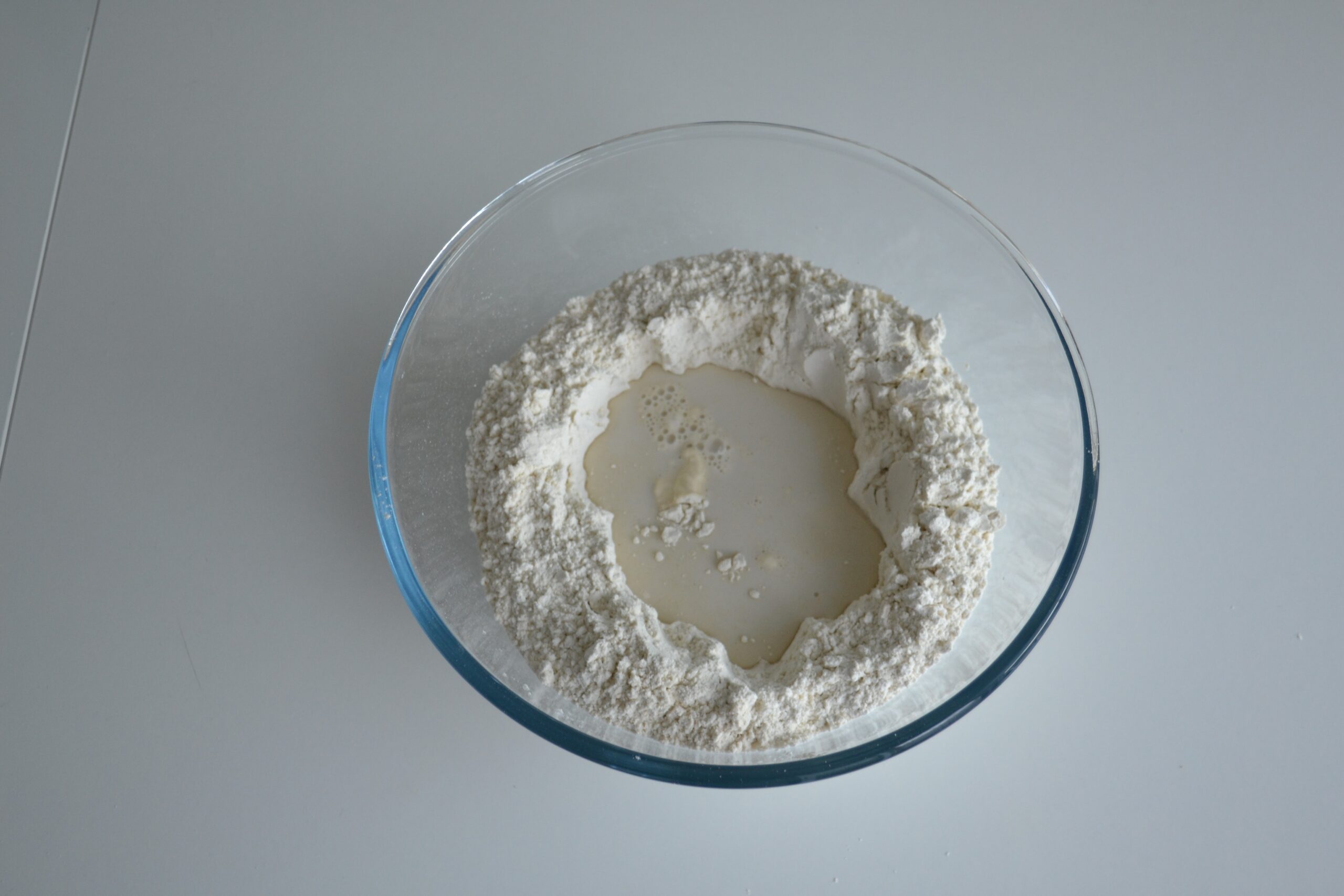 - Maak een kuiltje in de bloem en voeg de melk toe.