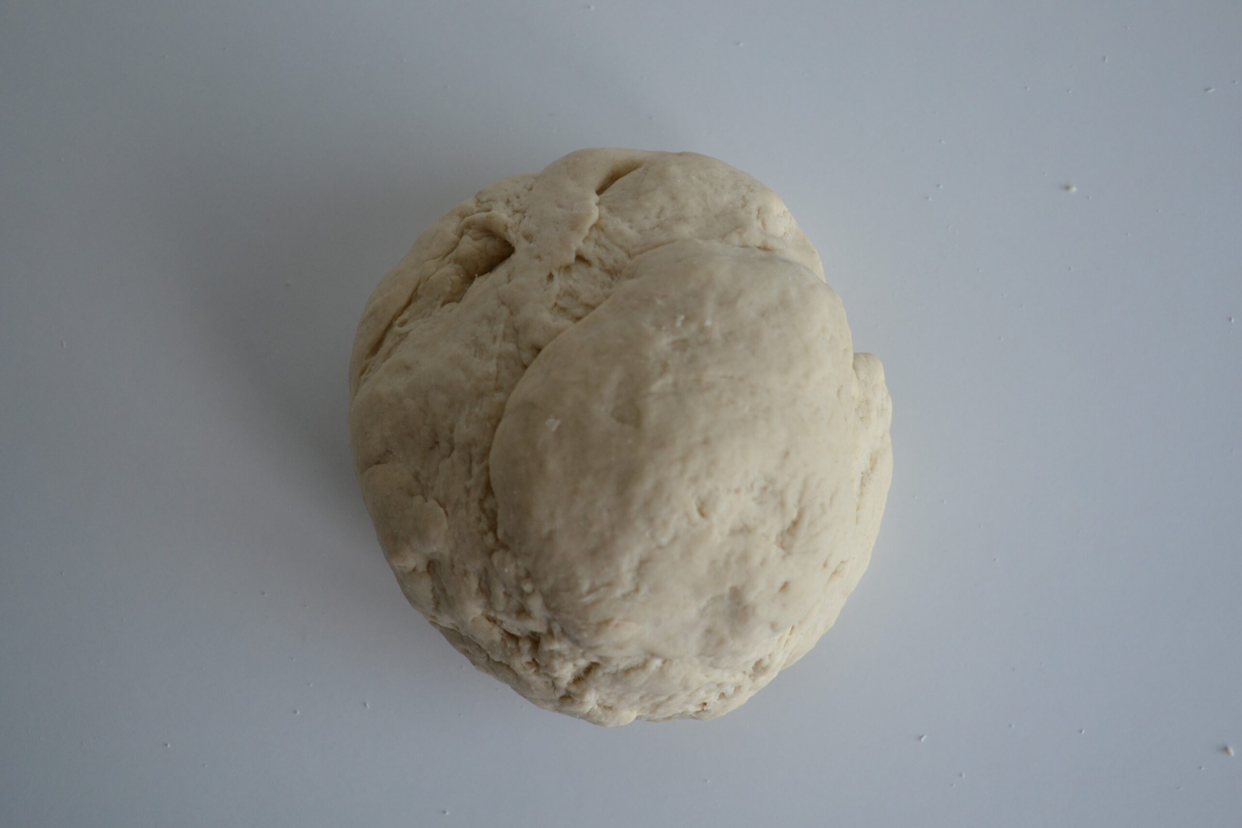 - Stort het deeg uit op tafel. Kneed nu verder tot een egaal deeg. Wees gerust, dit deeg wordt niet echt soepel en zal eerder wat stug blijven aanvoelen.