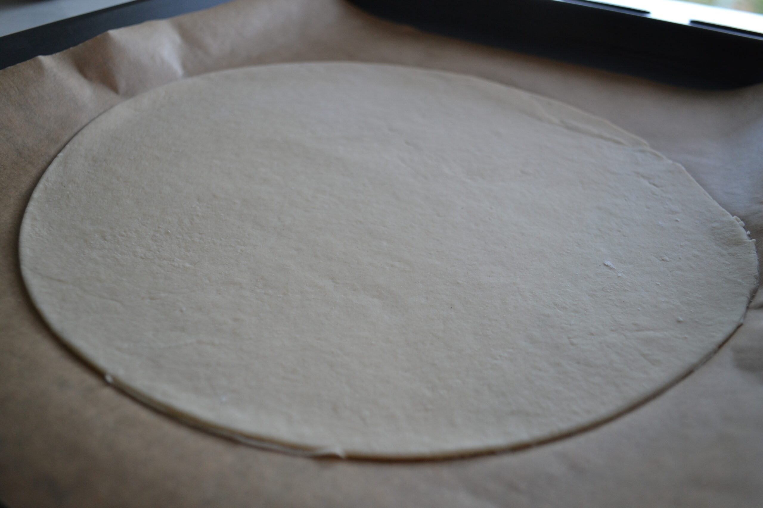 - Neem 1 bolletje deeg en rol het uit tot een bodem met een diameter van ongeveer 30 cm.