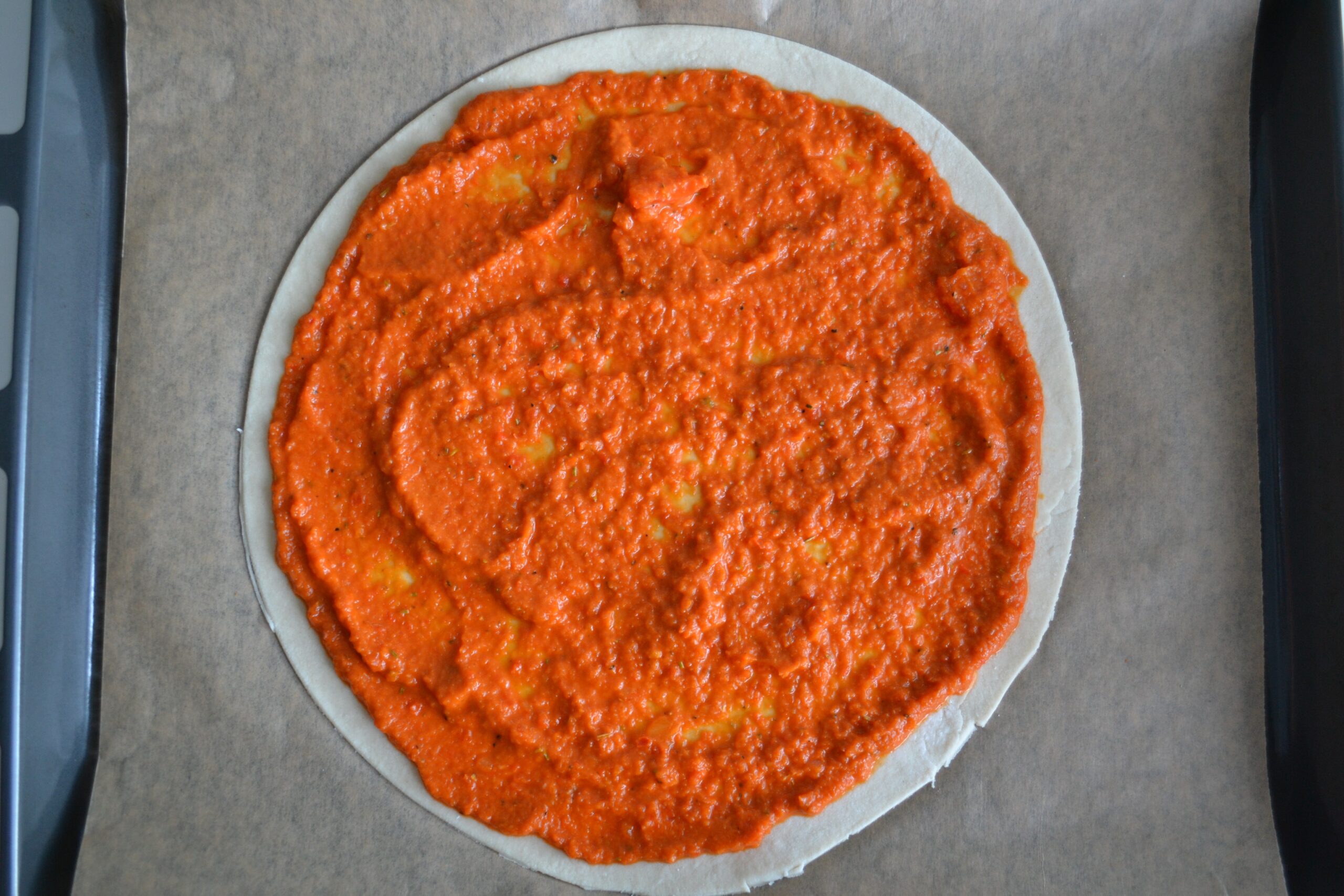 - Verdeel 2 à 3 grote lepels paprikasaus over de pizzabodem.