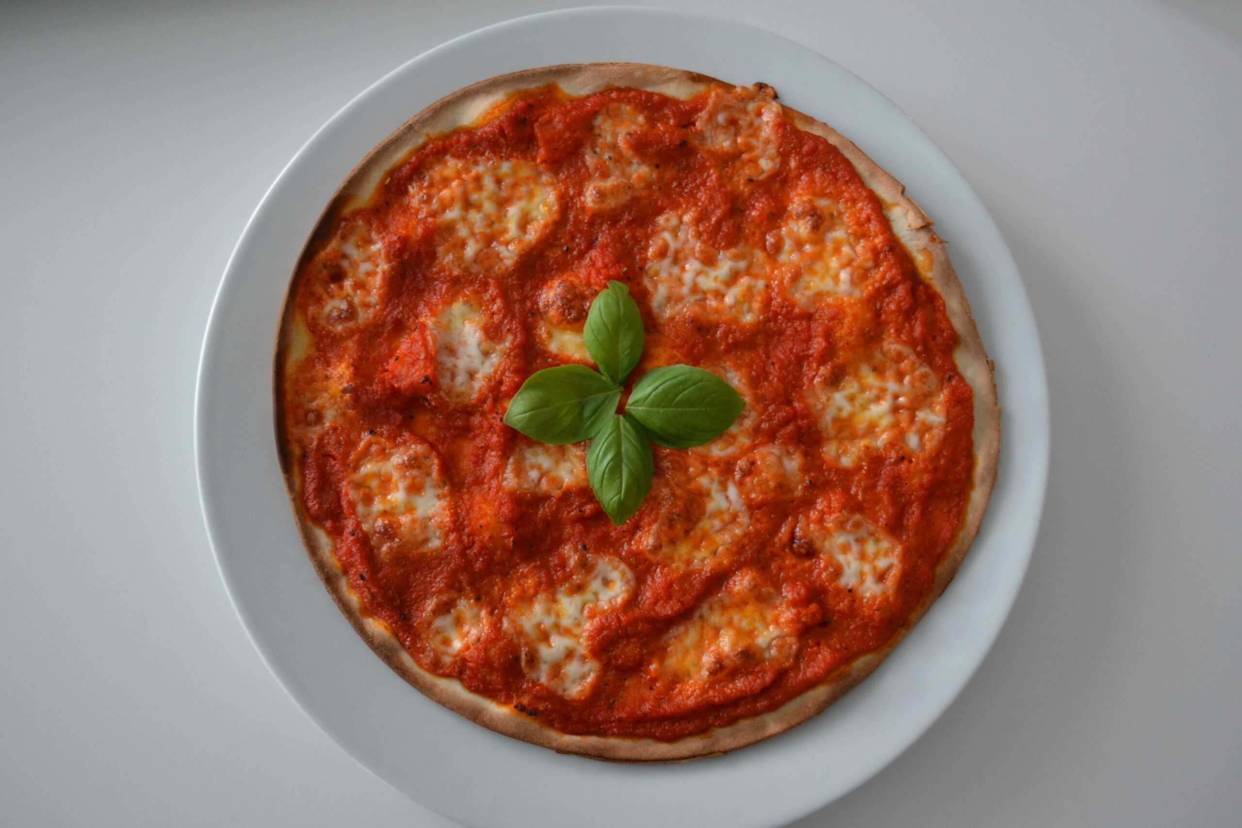 - Werk de pizza af met enkele blaadjes basilicum.